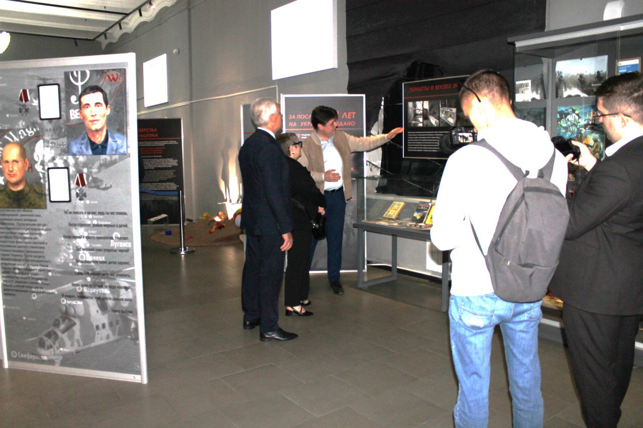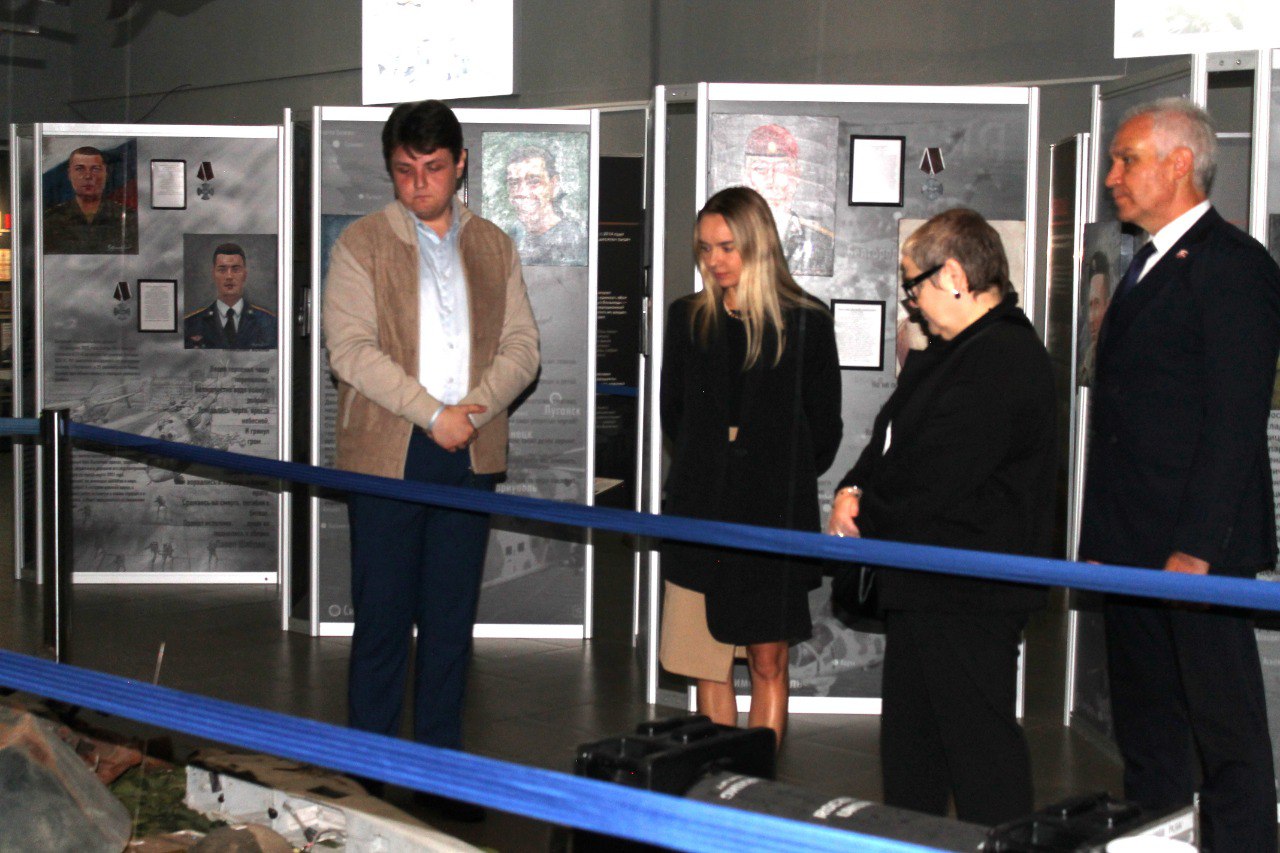 Директор музея СВО Наталья Речман рассказала гостям об актуальных выставках, которые работают в данный момент в обоих залах – «Фронтовые медики. Наши дни» и «Они сражались за Родину».